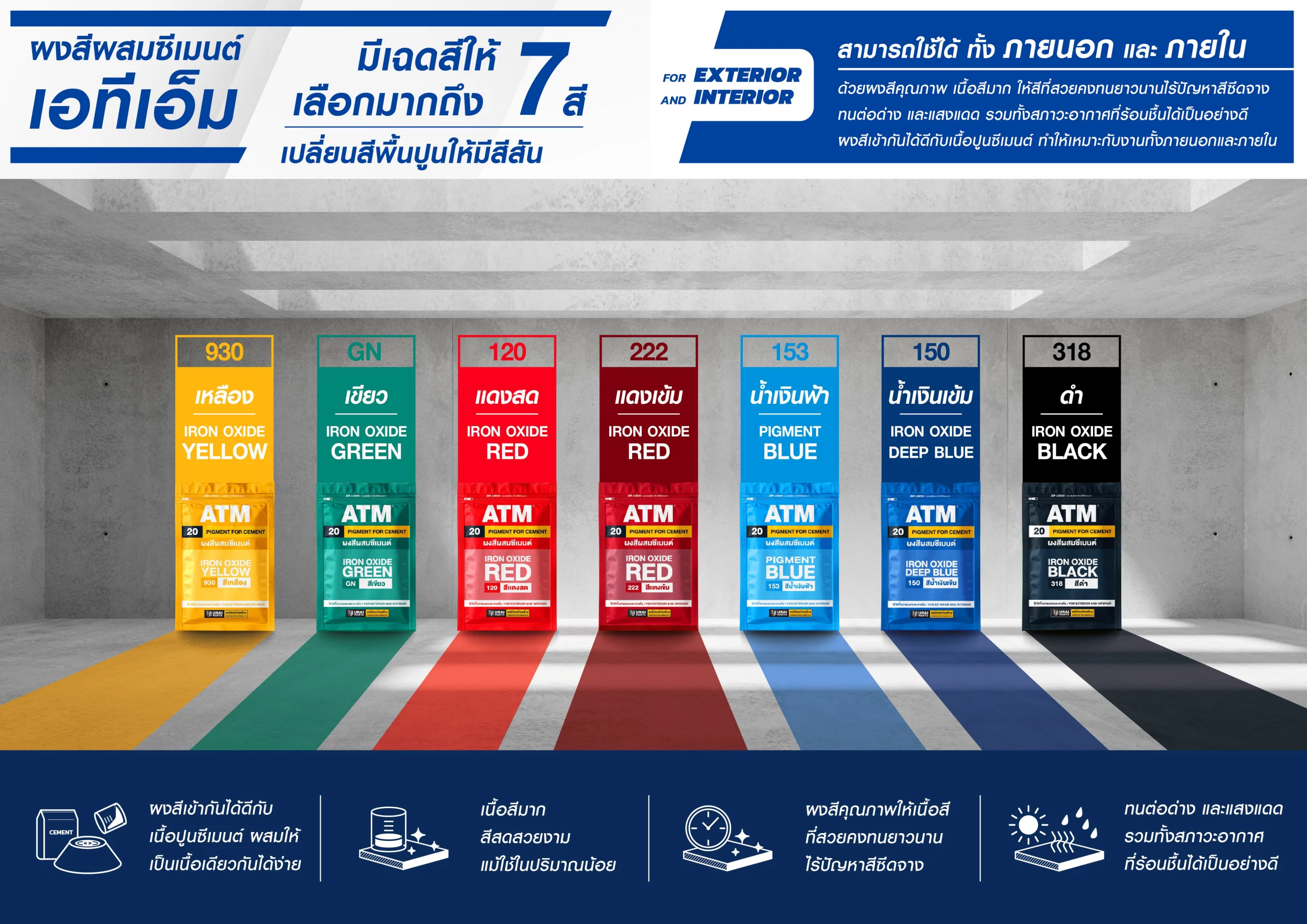 - ผงสีคุณภาพสูง สำหรับใช้ผสมในเนื้อปูนซีเมนต์ เพื่อให้เกิดสีในเนื้อปูน